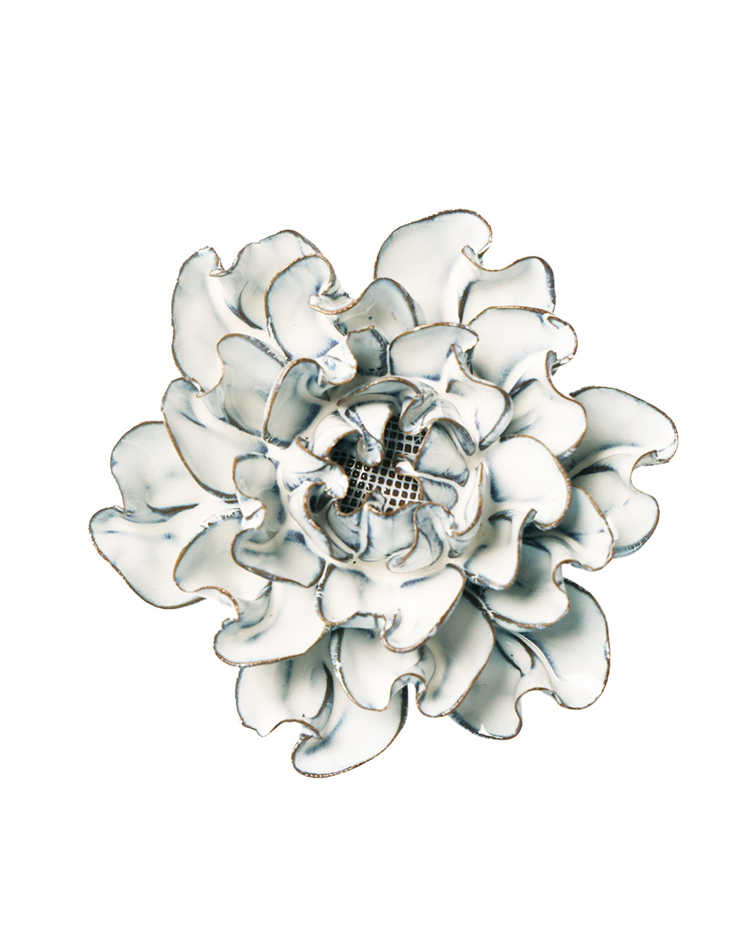 The Frosted Grey Chrysanthemum showcases a full, rounded form with numerous overlapping petals. Its matte-to-translucent finish creates subtle gradients throughout the piece, while the intricate layering adds visual interest from every angle.