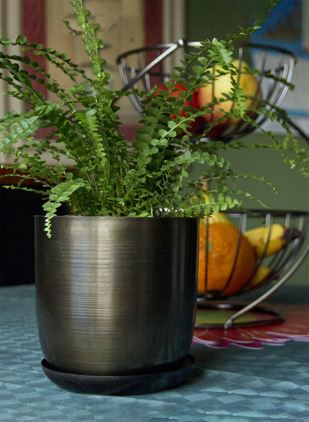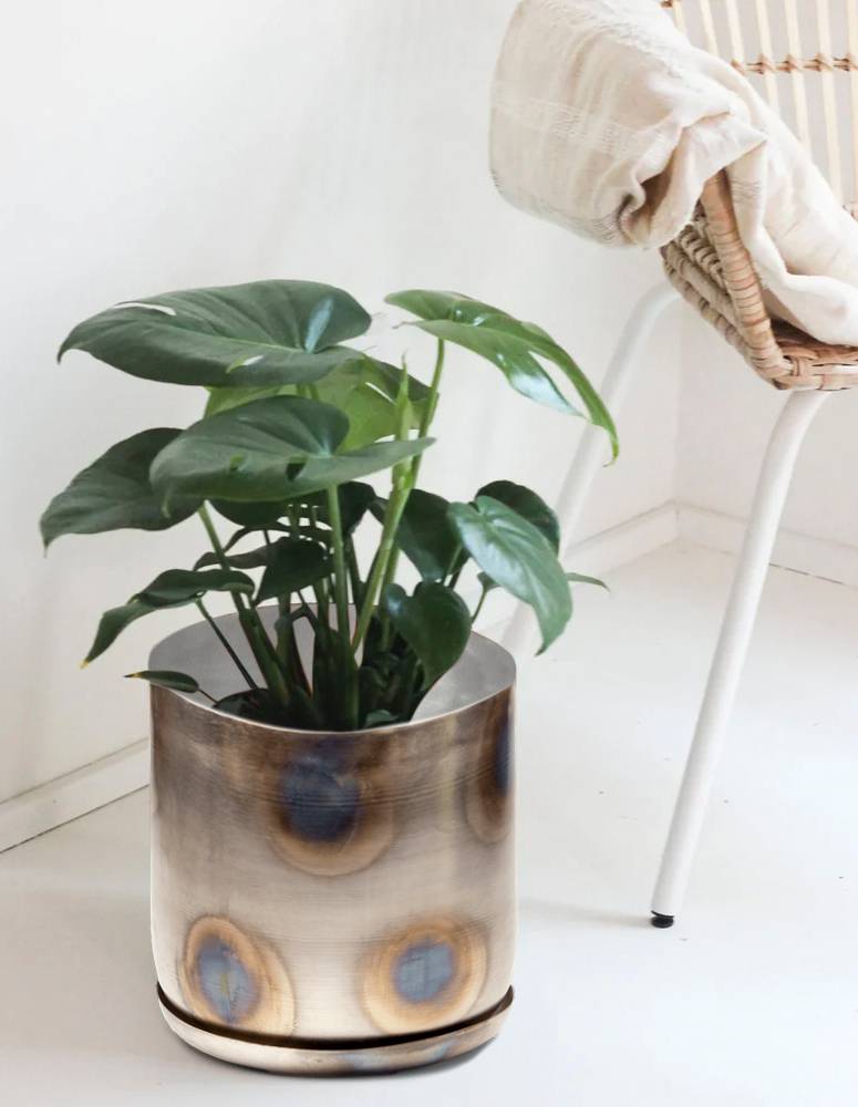 Todd says he can change everything he sees into a flower pot. One day in India, he saw a piece of brightly colored scrap metal in an ashtray. He played with acids and electroplating to come up with the 8 different finishes. And so, Joe was born. As if by magic...or should that be creativity?